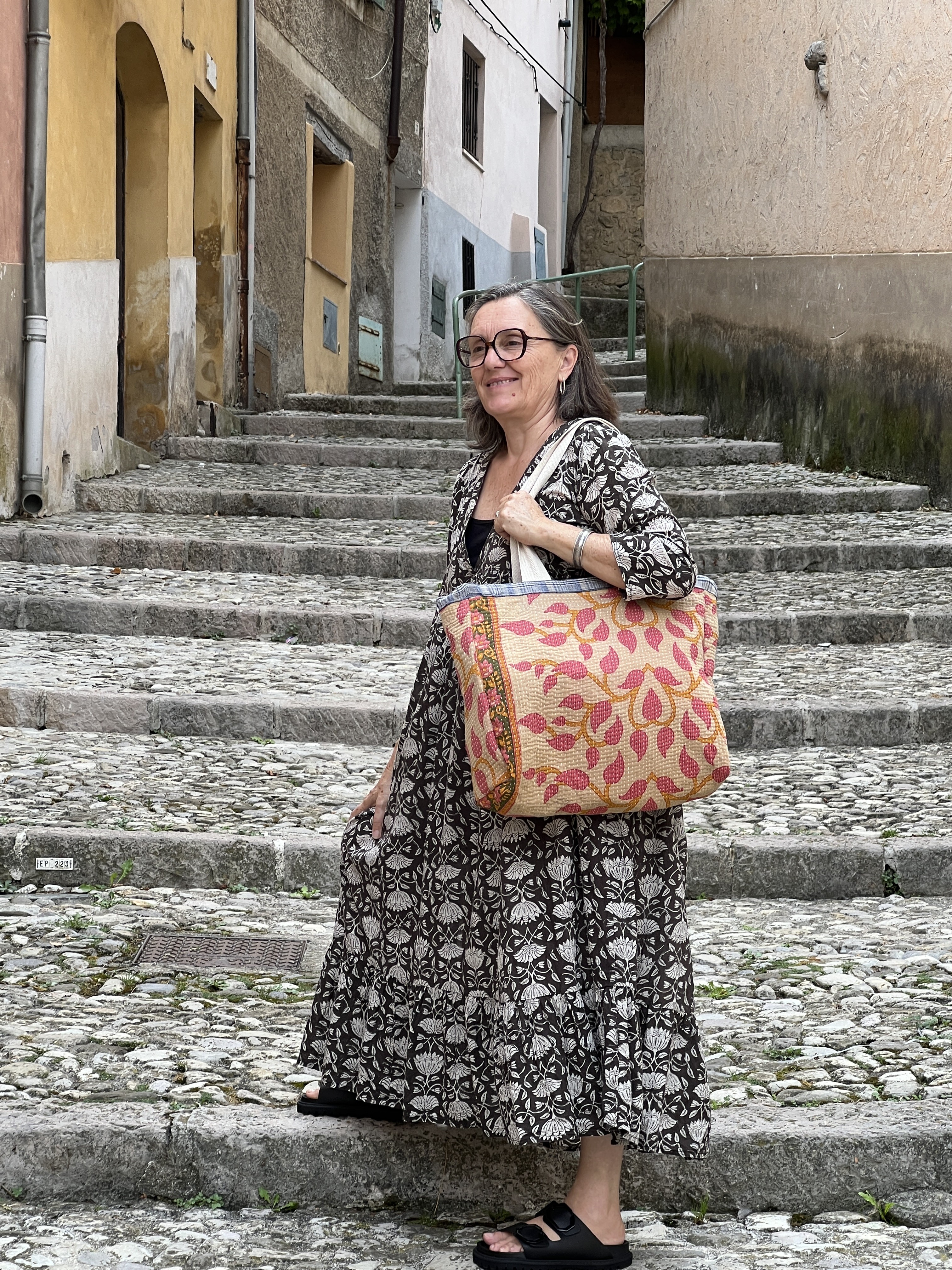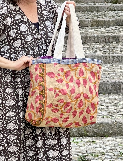 Le kantha est un savoir-faire ancestral du Bengale, où des morceaux de tissus sont superposés et brodés à la main avec des motifs traditionnels. Chaque pièce est unique, chargée de mémoire et de poésie, parfaite pour un accessoire à la fois durable et stylé.