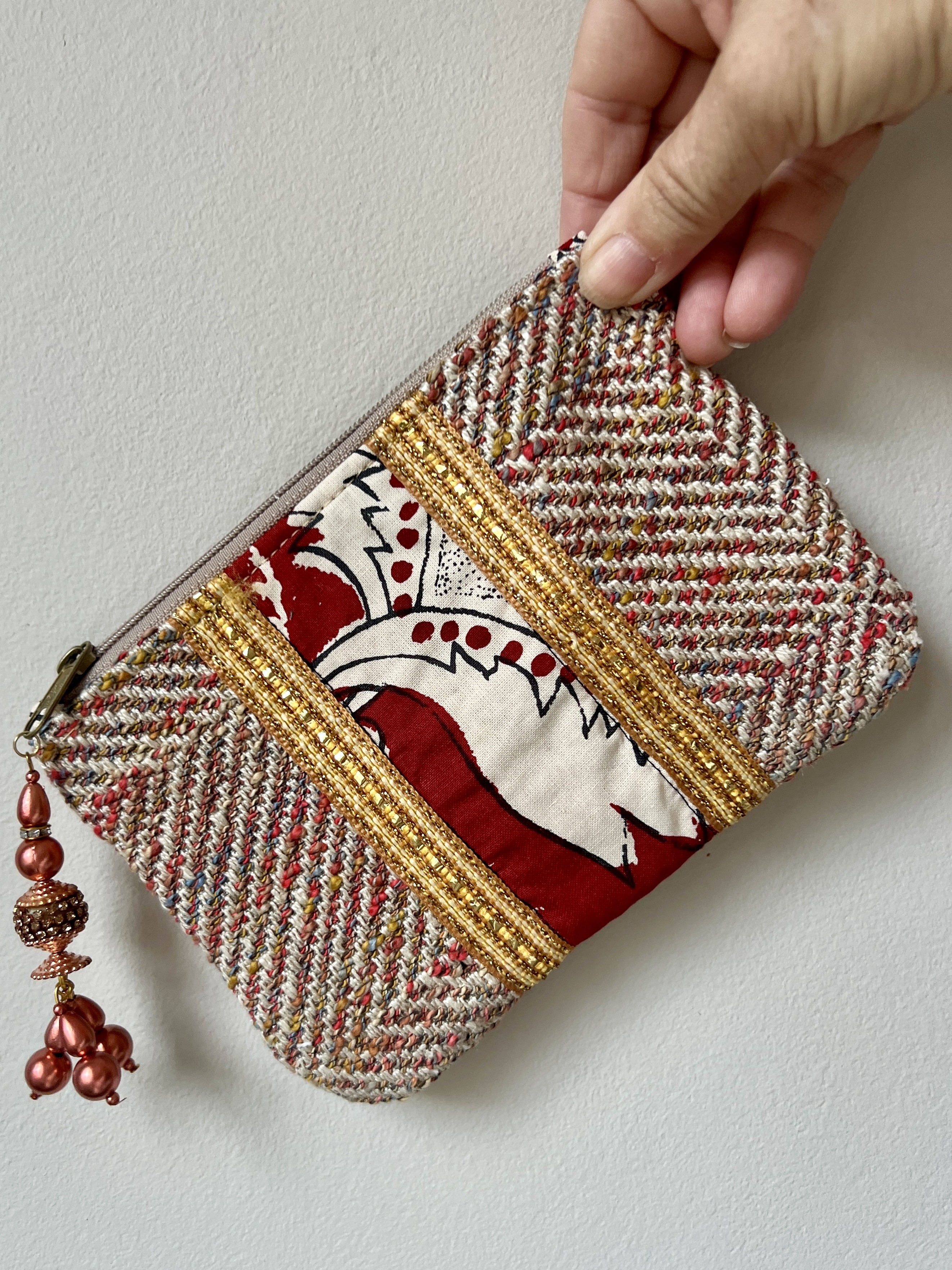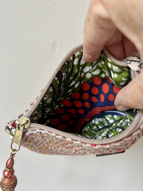 - Matières : tissu texturé, tissu imprimé floral, galons dorés, zip doré, pendentif en perles et pompons