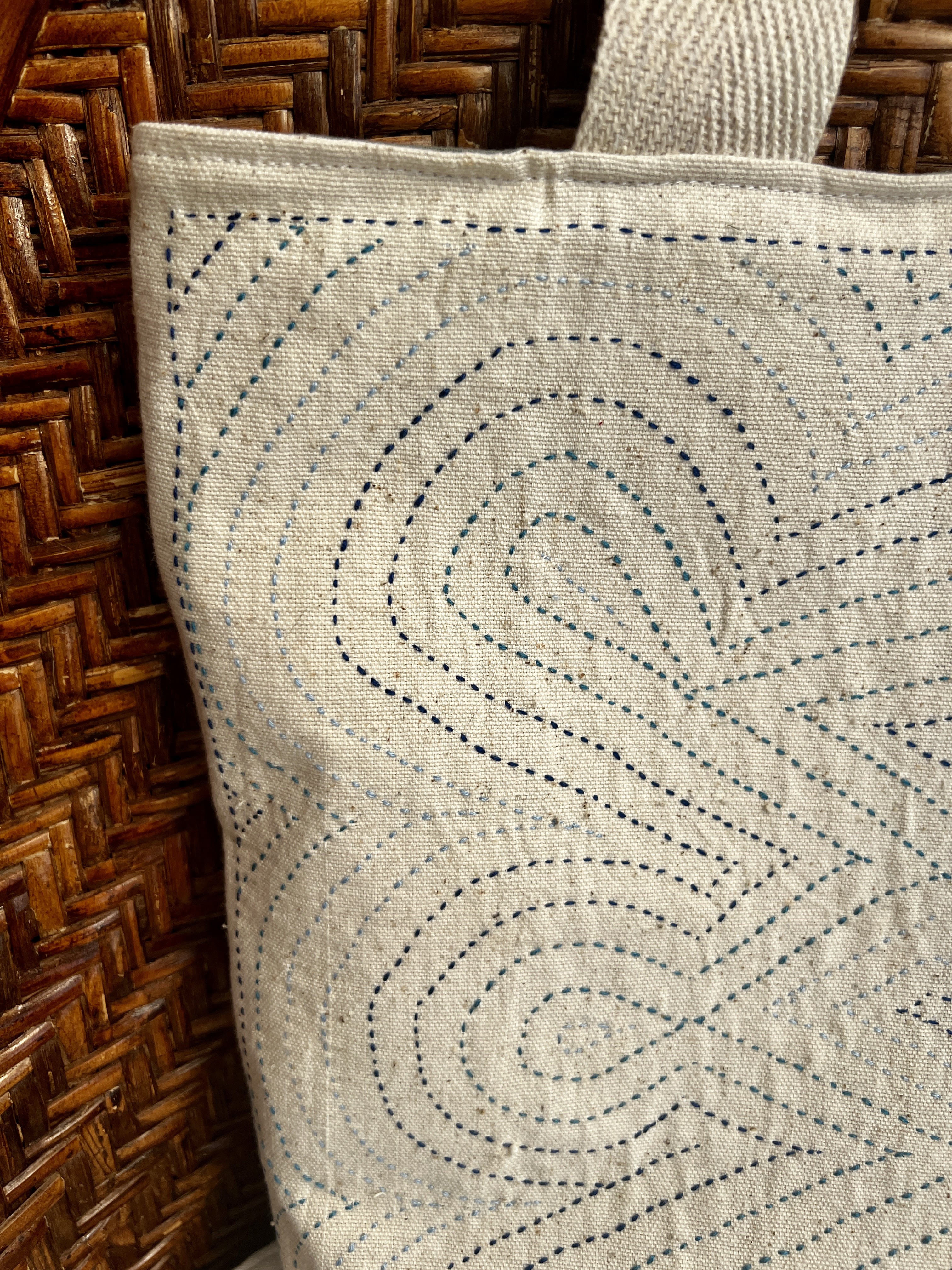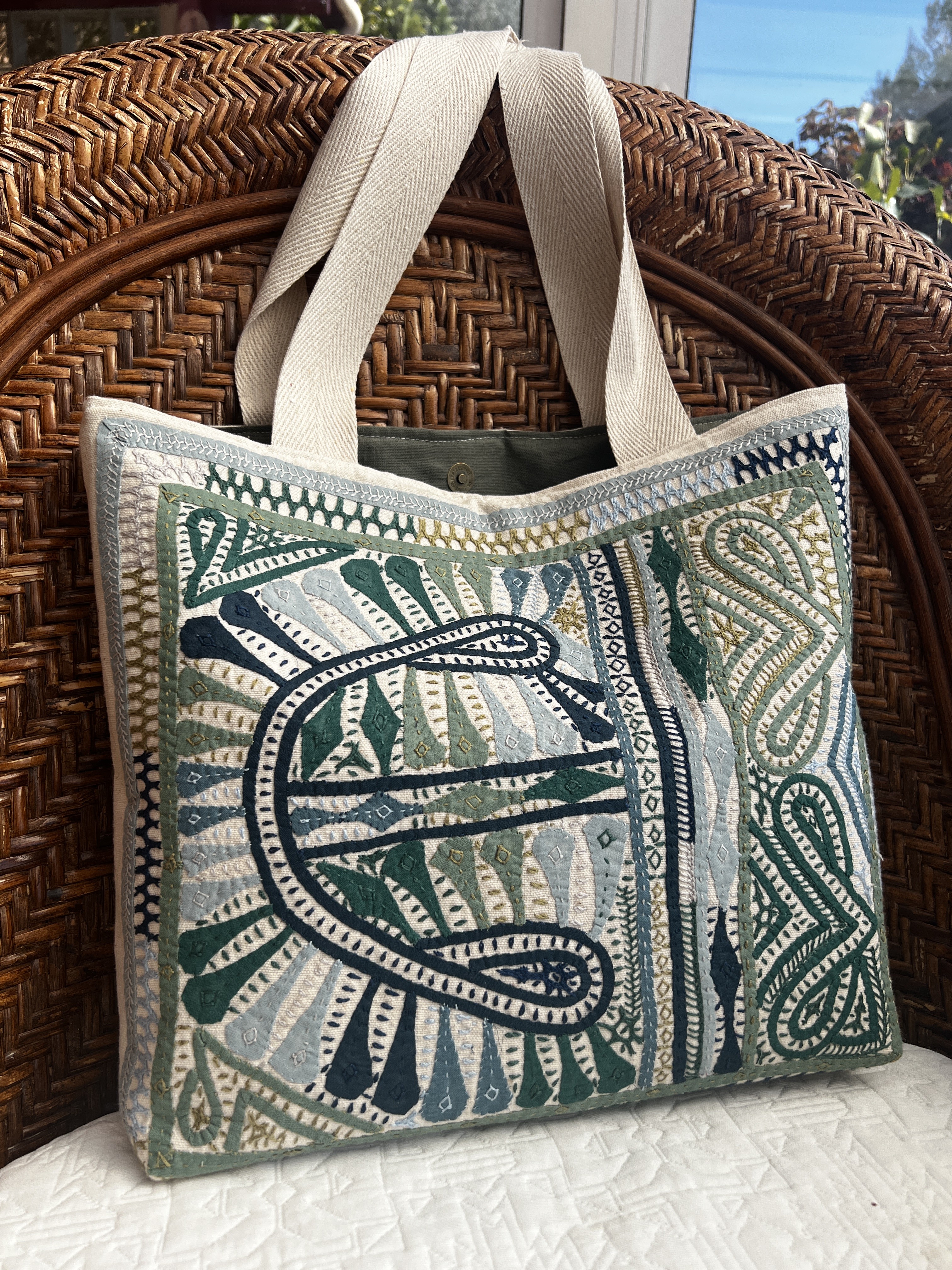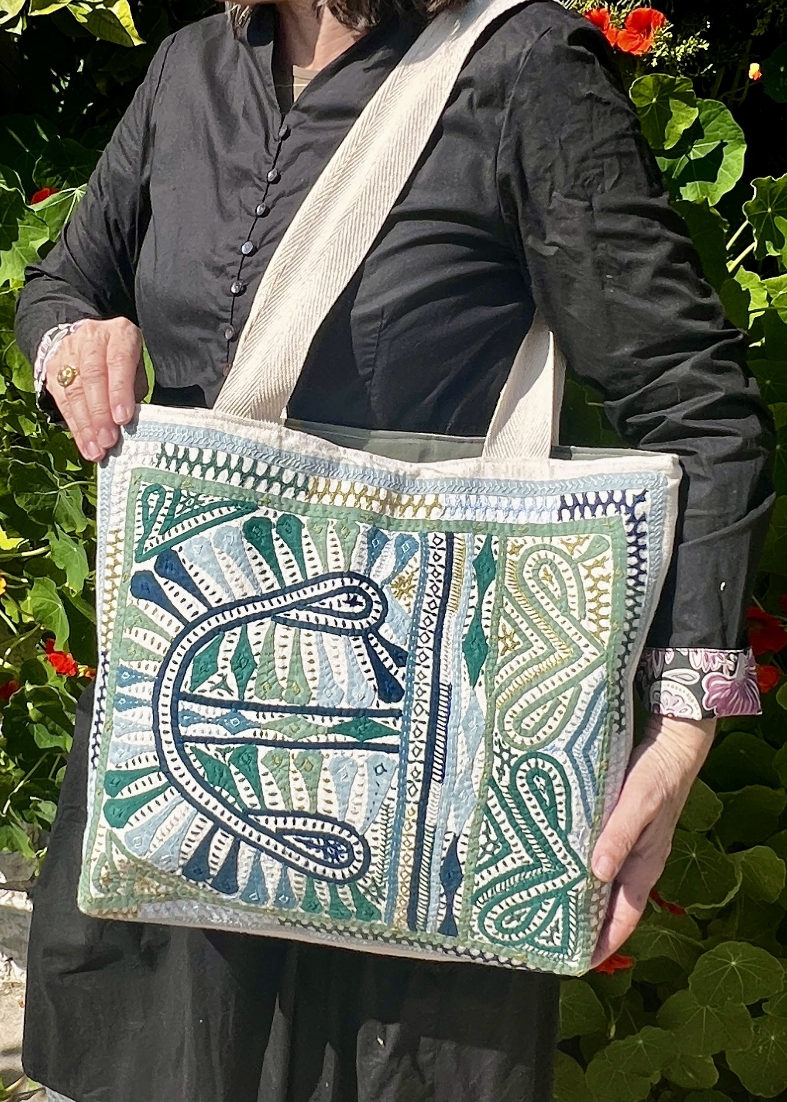 Ce qui rend ce cabas unique c'est sa broderie délicate , l'appliqué .Réalisée avec minutie par Geeta , de la communauté Rabari dans le son petit village du Gujarat , la technique apporte relief , texture et personnalité au tissu .Chaque point évoque un univers à la fois poétique et artisanal , transformant le sac en véritable objet d'art textile .