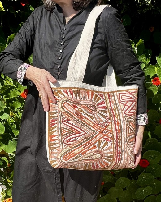 Ce qui rend ce cabas unique c'est sa broderie délicate , l'appliqué .Réalisée avec minutie par Geeta , de la communauté Rabari dans le son petit village du Gujarat , la technique apporte relief , texture et personnalité au tissu .Chaque point évoque un univers à la fois poétique et artisanal , transformant le sac en véritable objet d'art textile .