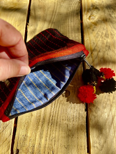 Cette pochette s’inscrit dans une démarche éthique et durable : réemploi de textiles, valorisation du travail artisanal et réduction des déchets.