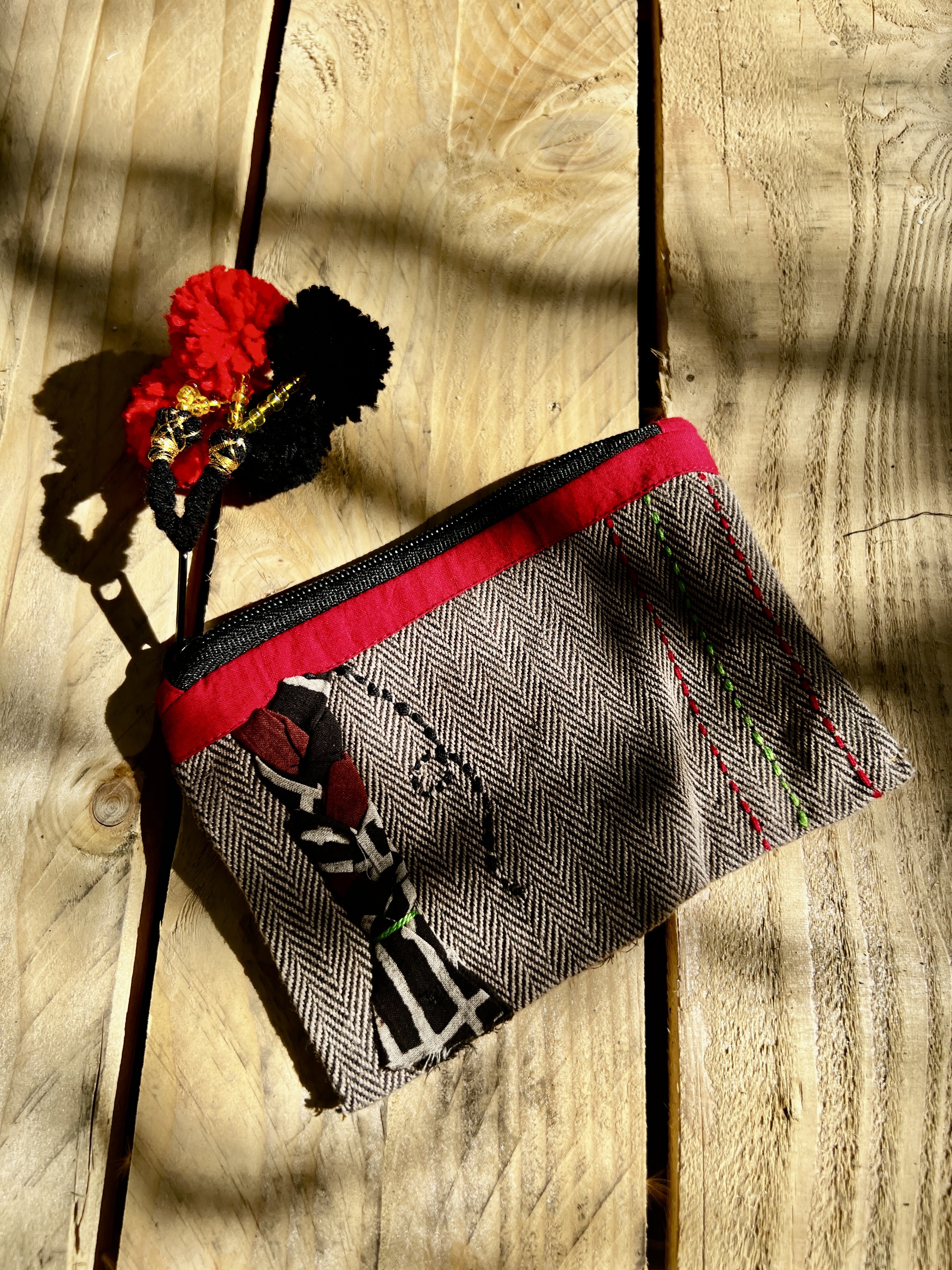 Cette pochette s’inscrit dans une démarche éthique et durable : réemploi de textiles, valorisation du travail artisanal et réduction des déchets.