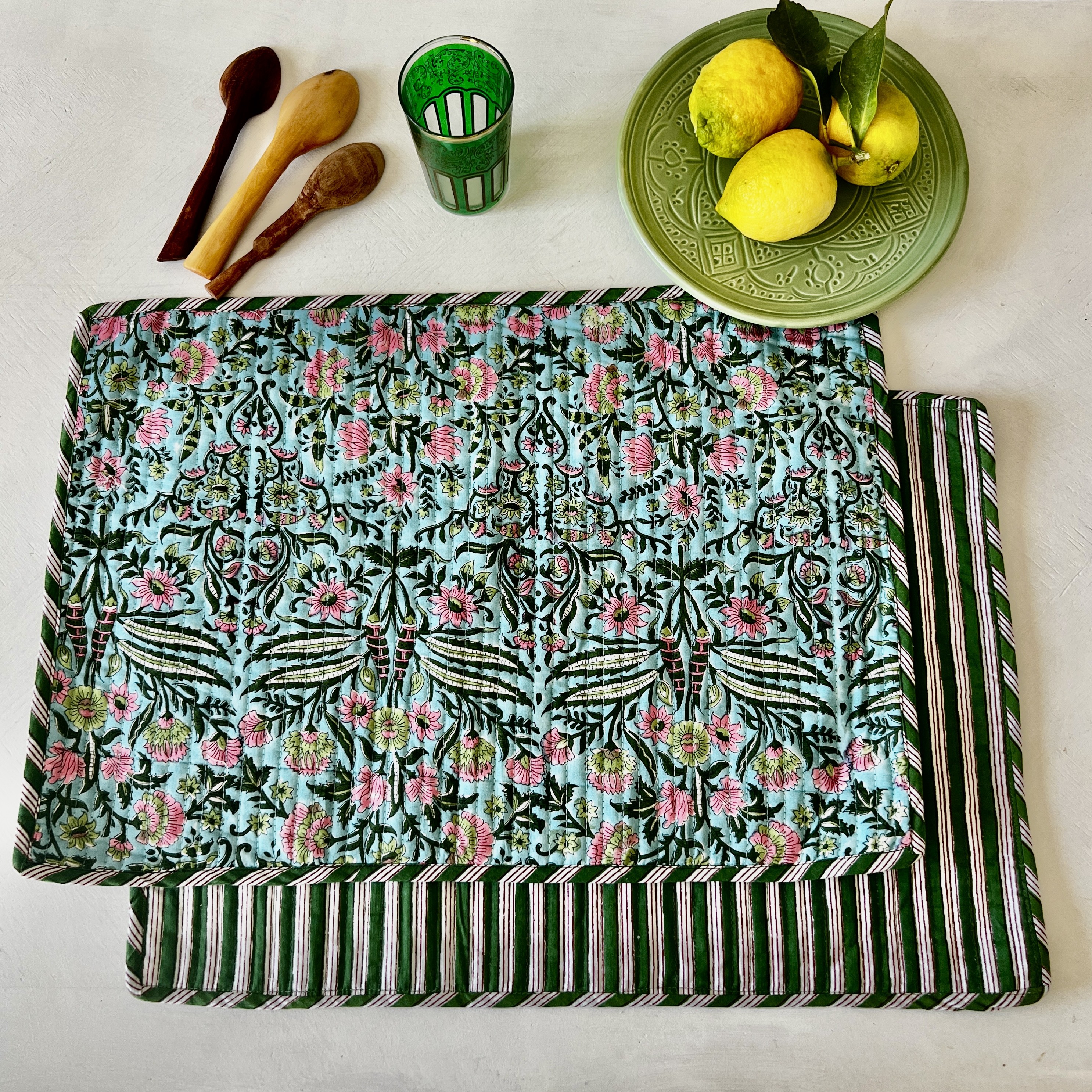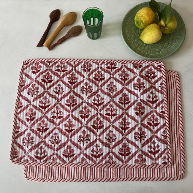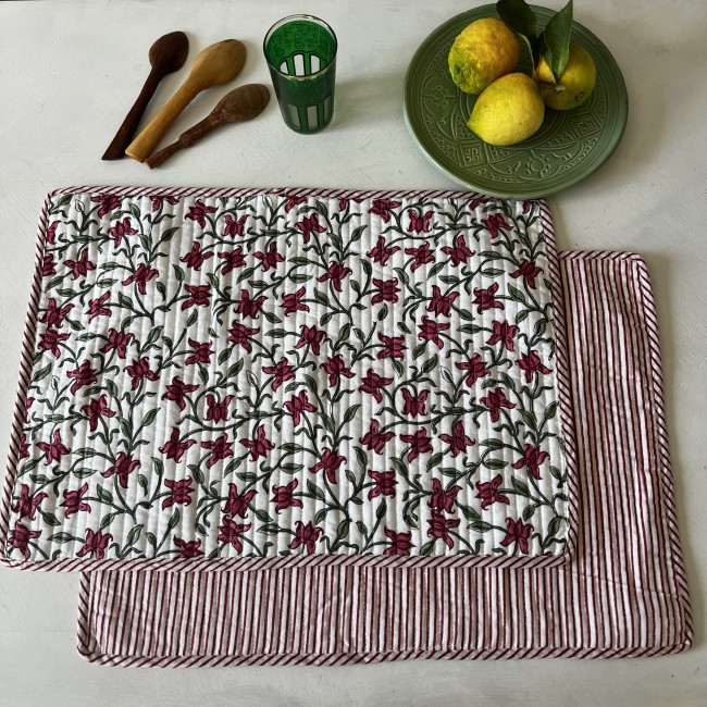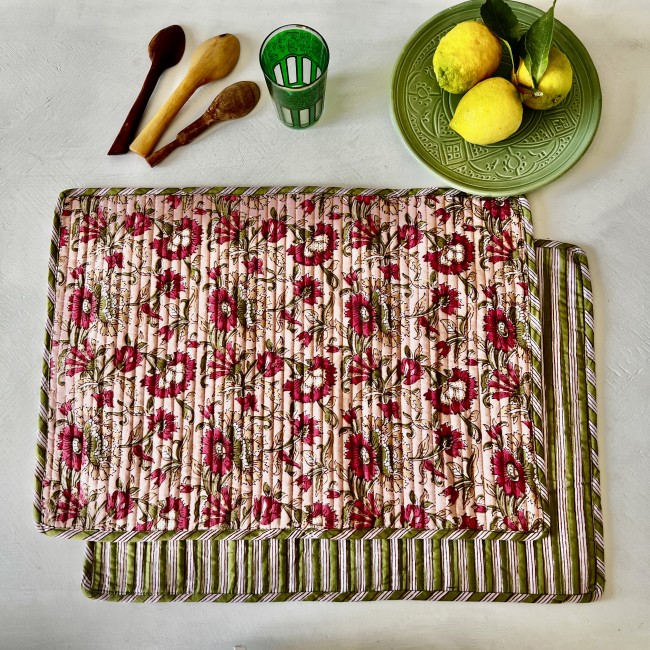 Ce set de table matelassé, confectionné en voile de coton, allie douceur, légèreté et authenticité. Son design réversible vous permet de varier les ambiances selon vos envies : le recto avec un imprimé floral délicat et vibrant, inspiré des motifs traditionnels indiens. Le verso avec de fines rayures élégantes pour une touche plus sobre et graphique